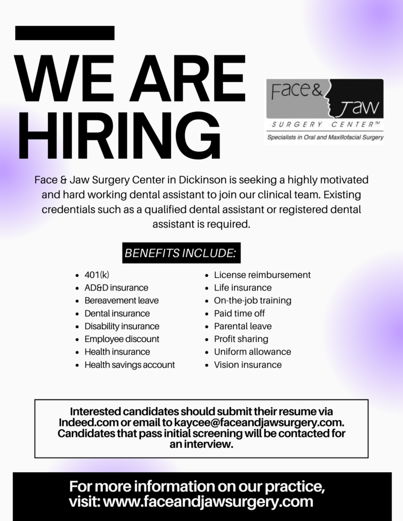 Sanford oral surgery is hiring a full-time surgical assistant. Go to Sanfordhealth.org for complete details and to apply.